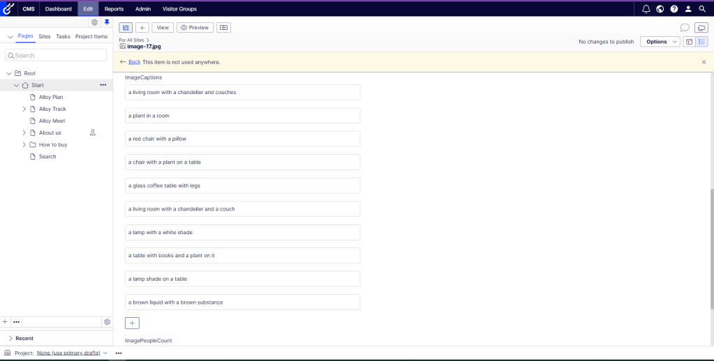 When the image caption feature has finished processing the image, the list of image captions are returned from the API as shown above. The image used for this produced 10 captions. Following this process, the aforementioned captions are then stored in an IList<string> property and published in the CMS. The resulting list is provided below: