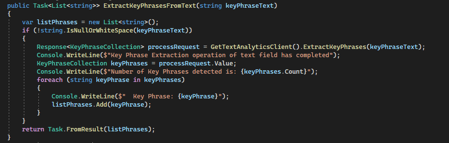 There is a screenshot below which demonstrates the code used to generate the list of Key Phrases from the Azure AI Language API